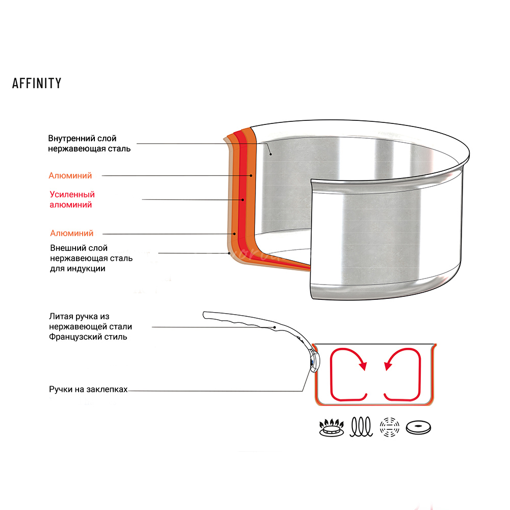 Сэндвич-основа равномерно распределяет тепло по всему дну посуду. Тепло распределяется снизу вверх по посуде и такой принцип распределение тепла идеально подходит для иммерсионной готовки и приготовления на пару.