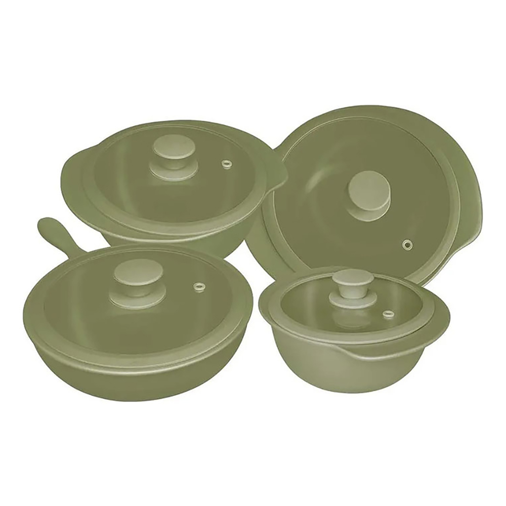 Посуда из этого материала обладает отличными качествами и служит как для приготовления пищи, так и для её хранения. Керамика хорошо набирает, хранит и равномерно распределяет тепло, поэтому многие повара мира выбирают её для приготовления пищи: качество блюд получается всегда на высоте. Так как керамика регулирует уровень влажности, то изделия из неё выступают как натуральный термос. В такой посуде продукты дольше хранятся в готовом виде. Крышки же для посуды производят из закалённого стекла, при этом края и ручки выполнены из термостойкого силикона.